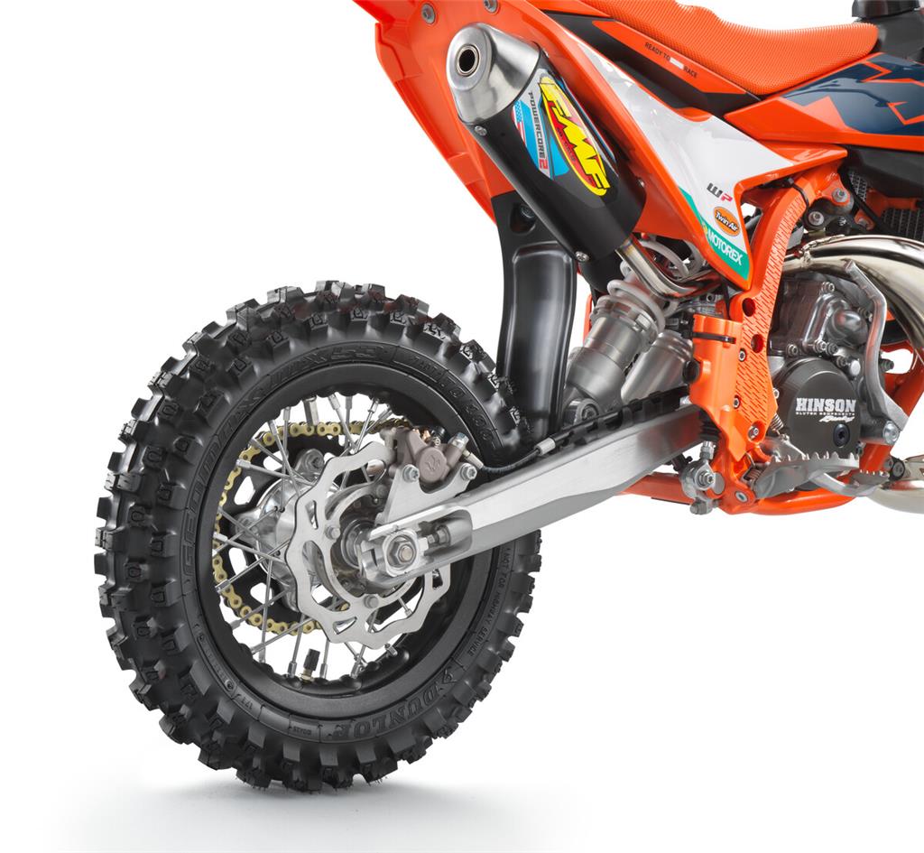 Rolling off the race rig and into the pit lane, the KTM 50 SX FACTORY EDITION uses lightweight, black anodized, aluminum rims like the full-size KTM SX range. These provide the highest levels of strength and reliability; DUNLOP Geomax MX53 tires deliver outstanding performance on any terrain and exceptional straight-line stability.