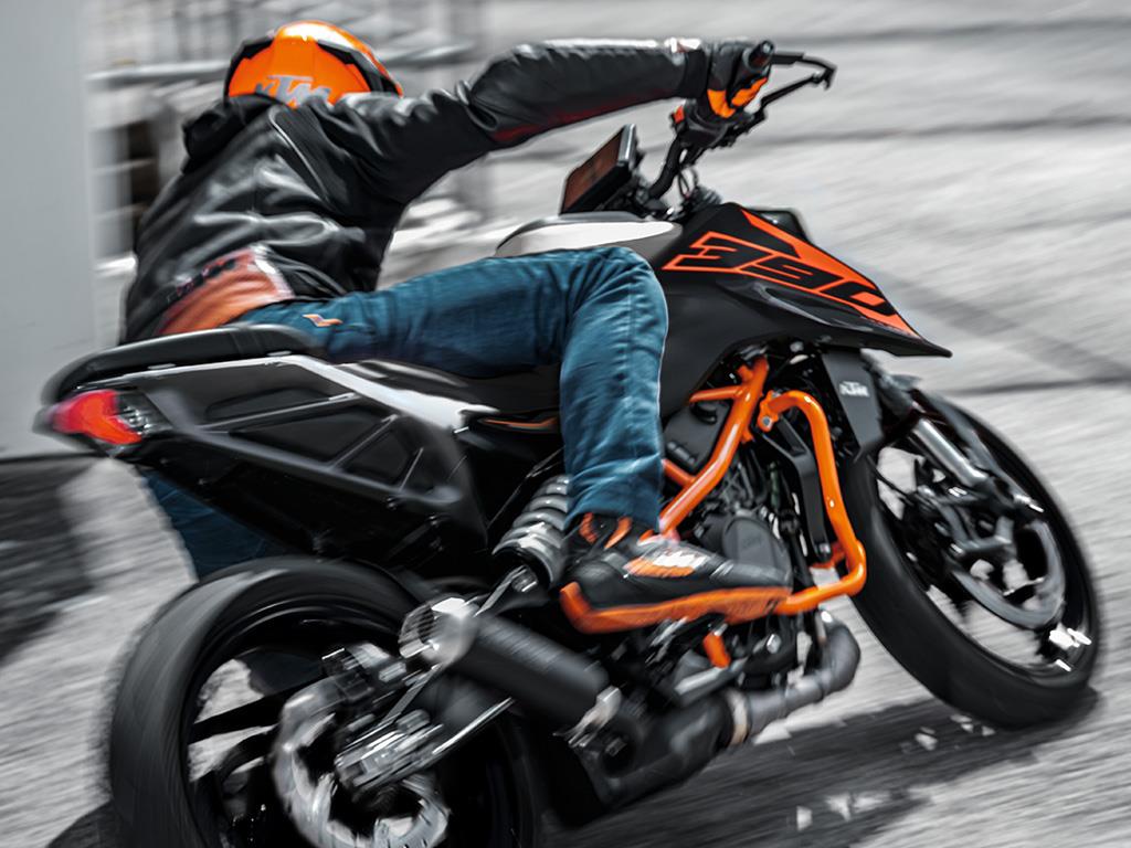 Boasting the latest generation in LC4c engines, the KTM 390 DUKE muscles up with a 399 cc capacity, more power, smoother acceleration, and lighter overall weight than the previous generation. Drawing from years of experience in the small engine game, the KTM 390 DUKE now also features an improved gearbox, and an optimized cylinder head, and is ready to adopt EURO5+ emission standards. Oh, and did we mention it is also READY TO RACE?