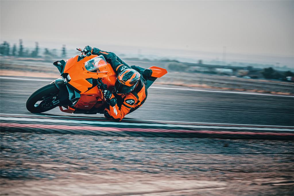 The KTM 990 RC R's ergonomics are standout. To ensure that the rider is integrated in a way to grapple the Supersport DNA of the bike without compromising day-to-day comfort and practicality, KTM has fashioned a tank shape with 6 contact points. The form of the product will suit a wide range of heights and permits the rider to 'glide' around the motorcycle while still being able to exert control through legs, knees and arms. The KTM 990 RC R has aluminum clip-on handlebars, adjustable levers and adjustable footpegs: the standard 'street' setting can be moved 25 mm back and 17 mm higher for a more racing 'track' poise and more influence for full lean angles.