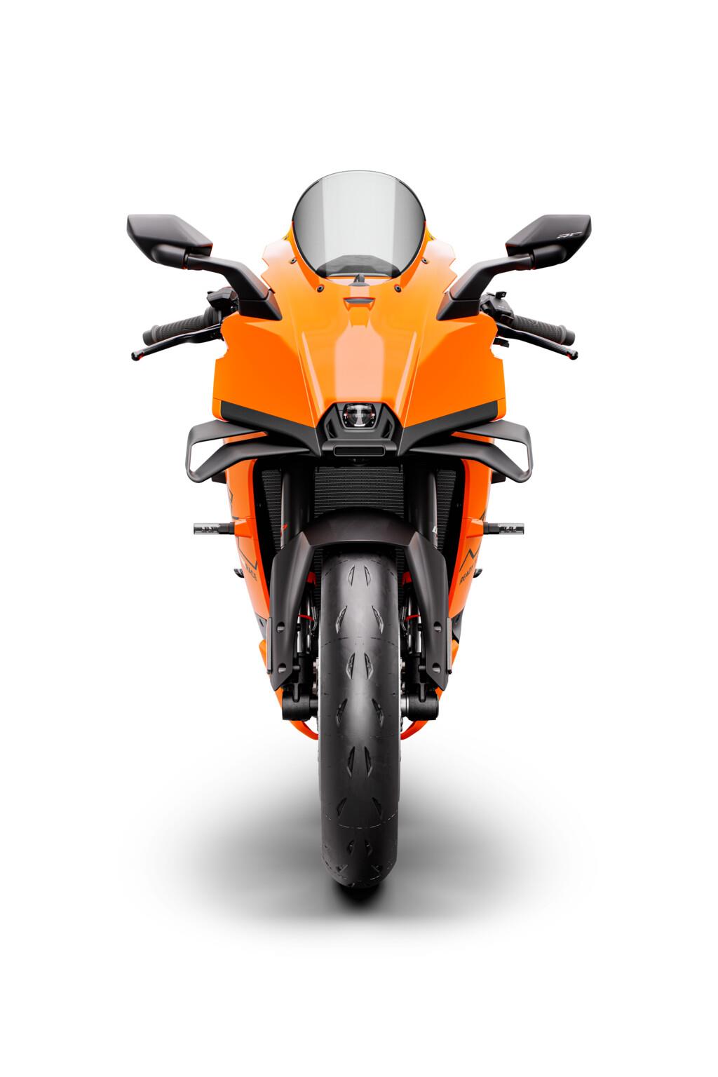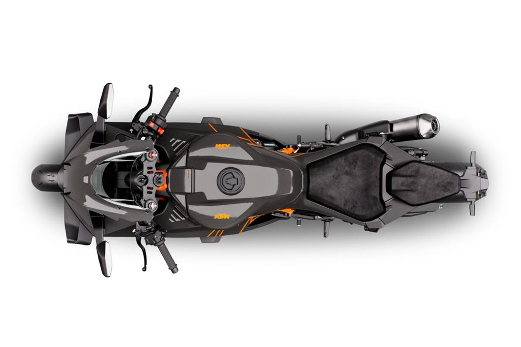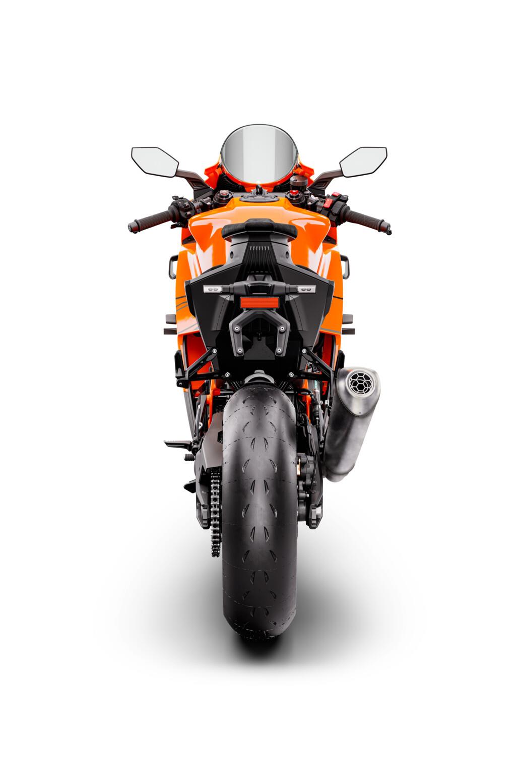 The KTM 990 RC R design language is singular and unmistakable. Turn on the TV during 22 weekends of the year and the aerodynamic and performance-thinking profiles of the KTM RC16s on the MotoGP grid will hit a chord. Mask shape, belly wings, and the wings on the front: they all look striking but also help with cooling and downforce, and therefore stability and braking performance. In terms of looks, is there a more razor-focused option on two wheels? Breathe it in. And would you like it in Electronic Orange or Black Metallic?